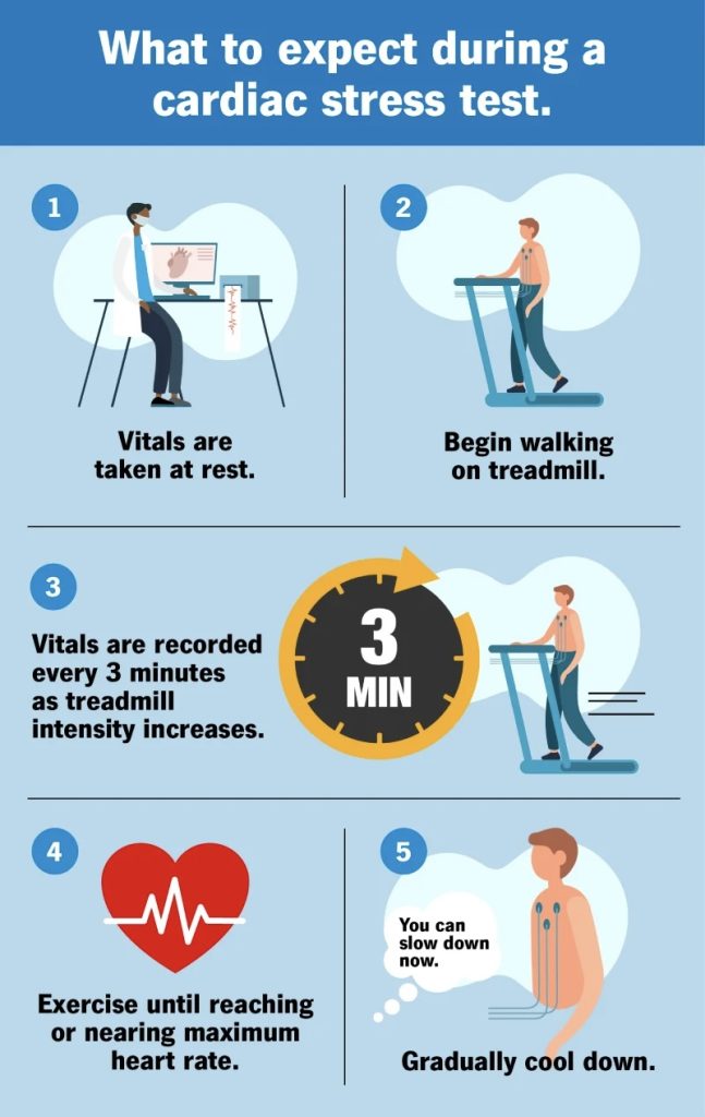 Exercise: You will walk on a treadmill or pedal a stationary bike. The intensity of the exercise will gradually increase while your heart rate, blood pressure, and ECG are monitored.